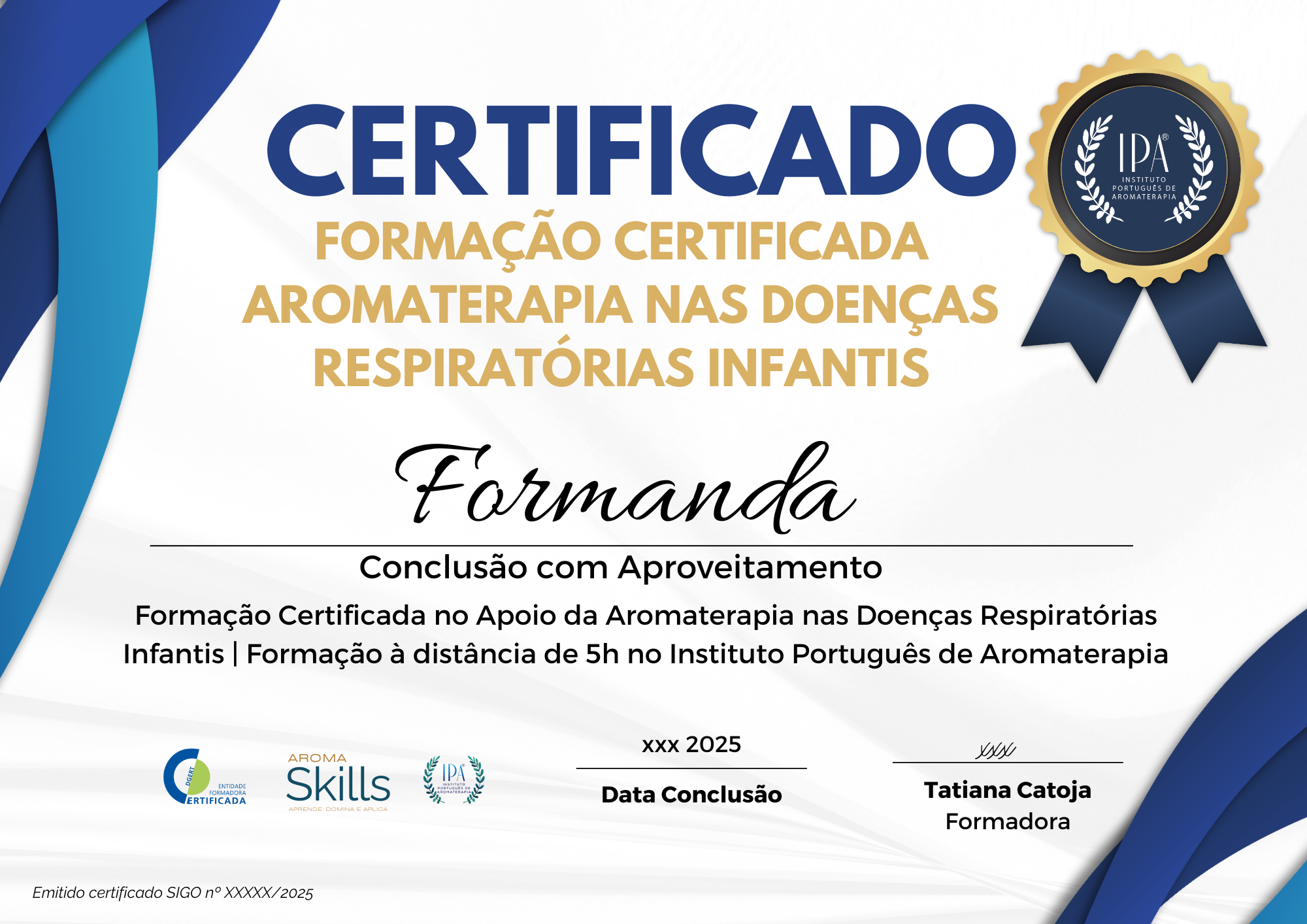 + Certificado de formação profissional SIGO/DGERT emitido pelo IPA - Instituto Português de Aromaterapia, na área da Saúde (729)